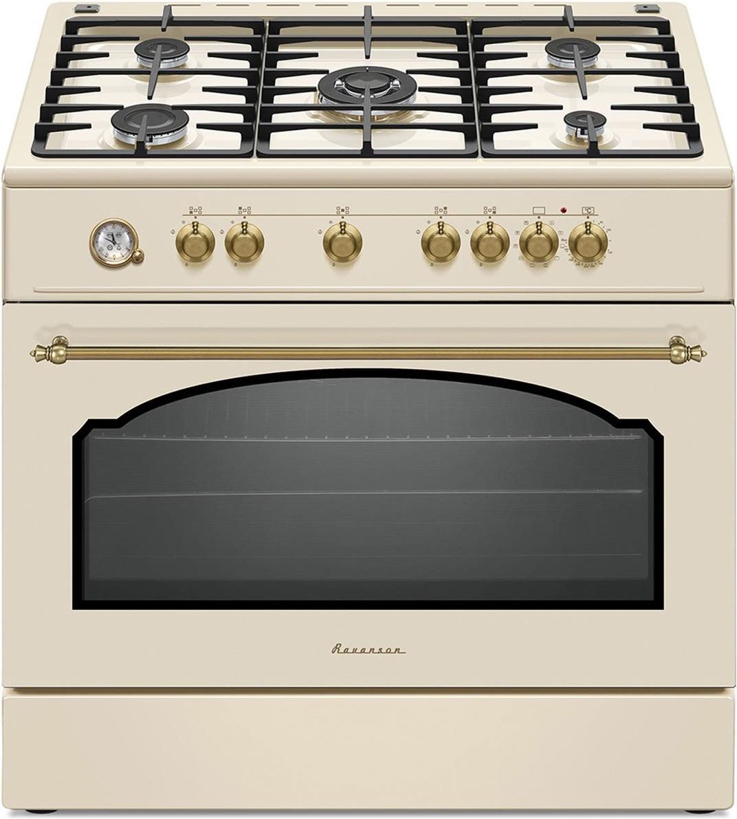 Specyfikacja Zegar Tak Materiał drzwi piekarnika Szkło Kolor uchwytu Złoty Typ produktu Kuchenka wolnostojąca Materiał obudowy Metal Typ kontroli Obrotowy Kolor produktu Kremowy Regulowane nóżki Tak Rodzaj rusztu Żeliwny Żaroodporne pokrętła Tak Zabezpieczenie przeciwwypływowe gazu Tak Zapalarka …