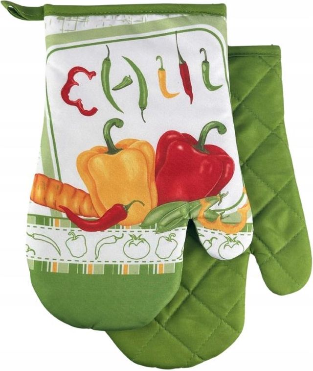 Rękawice kuchenne z magnesem 2 szt. 18x27cm, poliester, motyw dekoracyjny Rękawice kuchenne to podstawowy i niezastąpiony element wyposażenia każdej kuchni. Zapewniają ochronę dłoni przed wysoką temperaturą podczas gotowania, pieczenia czy grillowania. Dzięki różnorodnym motywom i kolorom, mogą także pełnić funkcję dekoracyjną. Prezentowany komplet składa się z dwóch rękawic – lewej i prawej – wykonanych z trwałego poliestru i wykończonych od wewnątrz warstwą izolującą z polipropylenu. Wbudowane magnesy oraz uchwyty umożliwiają wygodne zawieszenie rękawic lub ich przymocowanie do metalowych powierzchni, np. lodówki. Zalety Skuteczna ochrona dłoni przed gorącymi naczyniami Wszyte magnesy – możliwość przyczepienia do metalowych powierzchni Uchwyt do zawieszenia – wygodne przechowywanie Atrakcyjny nadruk – wzbogaca wygląd kuchni Klasyczny kształt z wyodrębnionym miejscem na kciuk Uniwersalne zastosowanie – do pieczenia, gotowania i grillowania Parametry Kolor: Wielokolorowy Rozmiar: Uniwersalny Długość: 27 cm Szerokość: 18 cm Materiał zewnętrzny: 100% poliester Materiał wewnętrzny: 100% polipropylen (włóknina izolacyjna) Zakres temperatury użytkowania: do 250°C Liczba sztuk w zestawie: 2 (prawa i lewa rękawica) Możliwość prania: Ręczne, maks. 40°C Dodatki: Wszyty magnes, uchwyt do zawieszenia