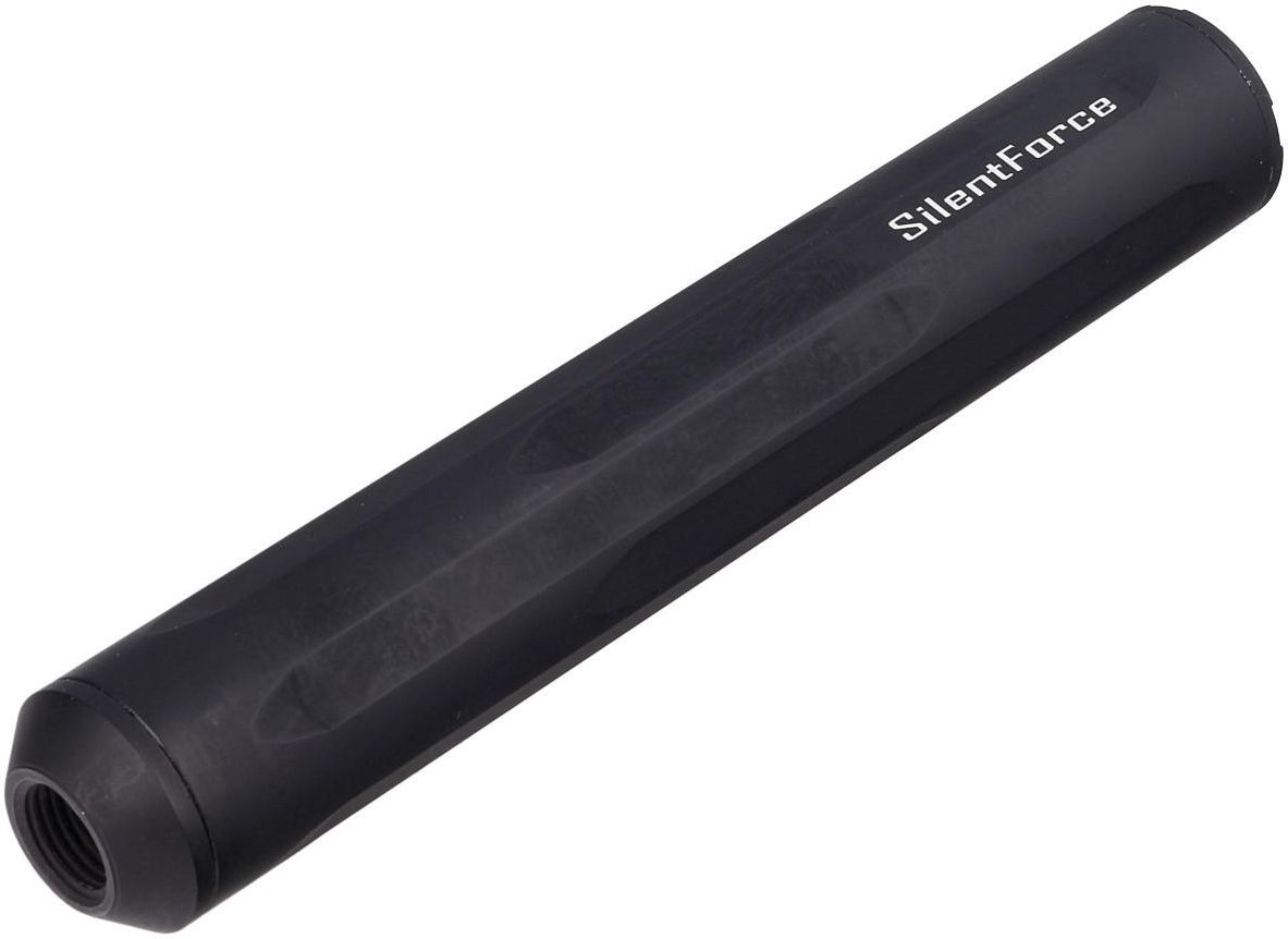 Tłumik Reximex SilentForce Long do wiatrówki z gwintem ½" UNF SilentForce ultralekki 82 g, aluminiowy tłumik dźwięku nowej generacji tureckiej firmy Reximex. Redukuje odgłos wystrzału o -50%. Przeznaczony do wszystkich modeli wiatrówek pneumatycznych pistoletów i karabinów z lufą zakończoną gwintem zewnętrznym ½" UNF, również innych producentów. Pasuje do wiatrówek w kalibrach .177 (4.5 mm), .22 (5.5 mm), .25 (6.35 mm). Długość 16 cm