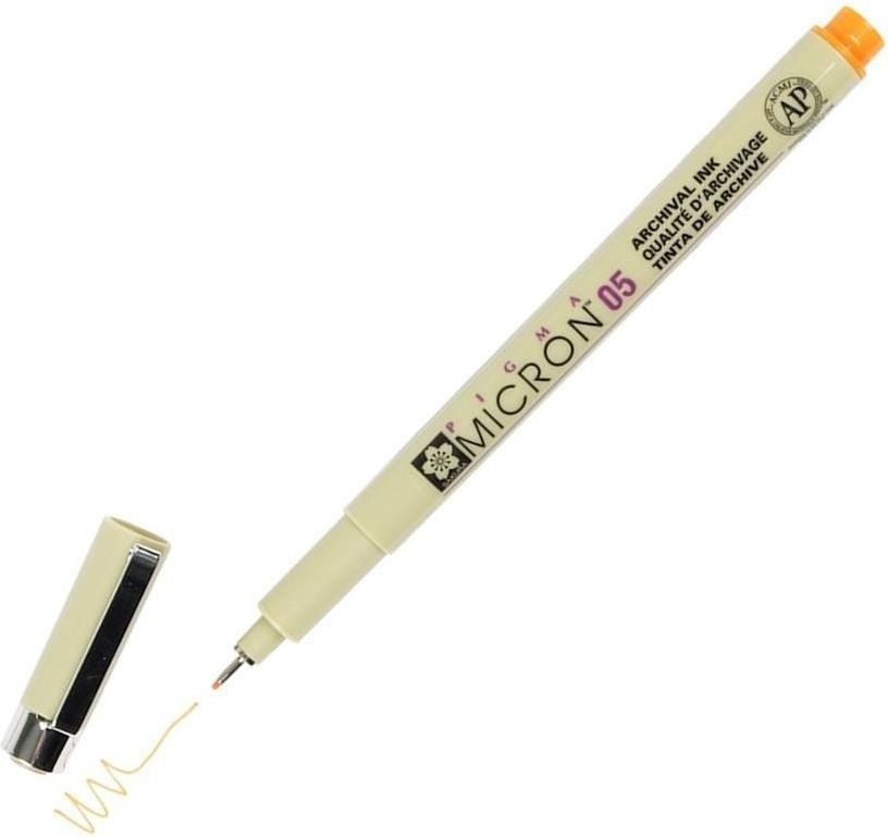 Sakura Pigma 05 Micron Cienkopis 05 Orange 0,45mm Sakura Pigma Micron 05 to profesjonalne, precyzyjne cienkopisy z unikalnym tuszem archiwalnym na bazie wody cienkopisy doskonale nadają się do pisania oraz rysunku technicznego, prac plastycznych, ilustracji; zastosowań hobbystycznych, takich jak scrapbooking; polecane także do popularnej techniki ZENTANGLE zalecane dla antropologów, entomologów, archiwistów, architektów, do wykonania profesjonalnych wzorównfrezów diamentowych, rysowników (Manga i Anime), artystów ilustratorów, artystów piszących po tkaninach budowa końcówki dozującej tuszu jest tajemnicą firmy i zapewnia doskonałą kontrolę, lekkość kreślenia i idealny przepływ tuszu pod każdym kątem szybkoschnący i nie przesiąkliwy przez papier grubość linii: 0,45 mm; końcówka metalowa kolor: pomarañczowy (05 Orange) produkowane wielkości ultra cienkich liniach: 005 (0,2 mm), 01 (0,25 mm), 02 (0,3 mm), 04 (0,35 mm), 05 (0,45 mm) i 08 (0,5 mm) zawarty tusz Pigma Ink to jeden z najlepszych tuszy, gładko piszący pigmentowy na bazie wody, trwały na różnych rodzajach papieru, w tym na papierze bezkwasowym, kalce technicznej oraz na porowatych powierzchniach stabilny chemicznie, odporny na blaknięcie i wodoodporny (jakość archiwalna) bezwonny, szybkoschnący i nieprzesiąkliwy przez papier produkt japońskiej firmy Sakura