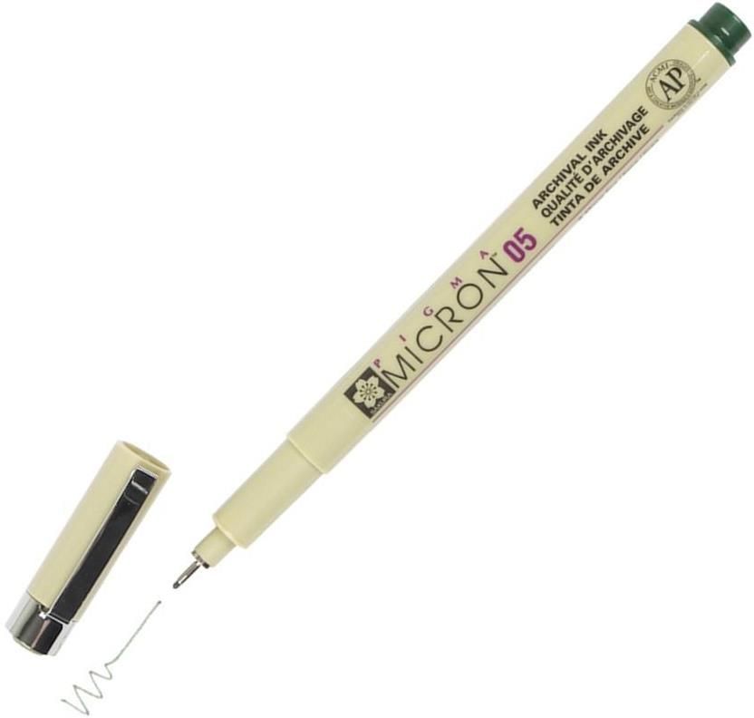Sakura Pigma Micron 05 to profesjonalne, precyzyjne cienkopisy z unikalnym tuszem archiwalnym na bazie wody cienkopisy doskonale nadają się do pisania oraz rysunku technicznego, prac plastycznych, ilustracji; zastosowań hobbystycznych, takich jak scrapbooking; polecane także do popularnej techniki ZENTANGLE zalecane dla antropologów, entomologów, archiwistów, architektów, do wykonania profesjonalnych wzorównfrezów diamentowych, rysowników (Manga i Anime), artystów ilustratorów, artystów piszących po tkaninach budowa końcówki dozującej tuszu jest tajemnicą firmy i zapewnia doskonałą kontrolę, lekkość kreślenia i idealny przepływ tuszu pod każdym kątem szybkoschnący i nie przesiąkliwy przez papier grubość linii: 0,45 mm; końcówka metalowa kolor: zielony (230 Hunter Green) produkowane wielkości ultra cienkich liniach: 005 (0,2 mm), 01 (0,25 mm), 02 (0,3 mm), 04 (0,35 mm), 05 (0,45 mm) i 08 (0,5 mm) zawarty tusz Pigma Ink to jeden z najlepszych tuszy, gładko piszący pigmentowy na bazie wody, trwały na różnych rodzajach papieru, w tym na papierze bezkwasowym, kalce technicznej oraz na porowatych powierzchniach stabilny chemicznie, odporny na blaknięcie i wodoodporny (jakość archiwalna) bezwonny, szybkoschnący i nieprzesiąkliwy przez papier produkt japońskiej firmy Sakura