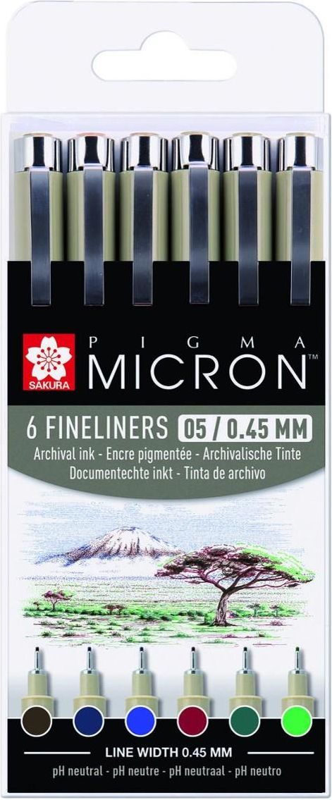 Sakura Atrament pigmentowy nie przenika przez papier Wodoodporny, odporny na blaknięcie i chemikalia, nie rozmazuje się po wyschnięciu Zestaw 6 cienkopisów w rozmiarze 0,45 mm Idealny do rysowania i ilustrowania, rysowania technicznego i konturowania Kolory: sepia, niebieski czarny, królewski niebieski, bordowy, zielony myśliwy i świeży zielony