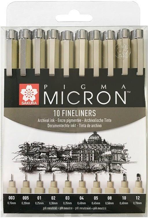 Zestaw pisaków precyzyjnych Pigma Micron japońskiej marki Sakura. Zestaw zawiera: Pisak w kolorze czarnym Pigma Micron 003 - 0,15 mm Pisak w kolorze czarnym Pigma Micron 005 - 0.20 mm Pisak w kolorze czarnym Pigma Micron 01 - 0.25 mm Pisak w kolorze czarnym Pigma Micron 02 - 0.30 mm Pisak w kolorze czarnym Pigma Micron 03 - 0.35 mm Pisak w kolorze czarnym Pigma Micron 04 - 0,40 mm Pisak w kolorze czarnym Pigma Micron 05 - 0.45 mm Pisak w kolorze czarnym Pigma Micron 08 - 0.50 mm Pisak w kolorze czarnym Pigma Micron 10 - 0,60 mm Pisak w kolorze czarnym Pigma Micron 12 - 0,70 mm Całość umieszczona w plastikowym etui. Profesjonalne, precyzyjne cienkopisy Pigma Micron japońskiej marki Sakura. Debiutując w 1982 roku były pionierskim rozwiązaniem, opartym o tusze na bazie wody. Przez ponad 30 lat pisaki podlegały stałym udoskonaleniom w oparciu o opinie i doświadczenia użytkowników z całego świata, co gwarantuje Państwu zakup artykułów o wysokiej jakości. Tusz Pigma Ink oferuje niezawodność, doskonałą odporność na środki chemiczne, wodę i blednięcie oraz trwałość na różnych rodzajach papieru. Odpowiednia pigmentacja to nasycone, transparentne kolory, zaś specjalna formuła tuszu gwarantuje, że linie nie będą przebijać na drugą stronę nawet najcieńszego arkusza papieru. Budowa końcówki dozującej tusz jest tajemnicą firmy - zapewnia doskonałą kontrolę, lekkość kreślenia i idealny przepływ pod każdym kątem. Pigma Micron wyznacza standardy dla pozostałych produktów tej kategorii.