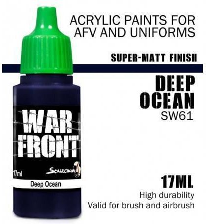 SCALE75 SW61 WARFRONT: DEEP OCEAN 17ml SCALE75 Firma/Manufacturer: Scale75 Numer katalogowy/catalogue number: SW61 Pojemność/Capacity: 17ml EAN: 8423153060059 Farby akrylowe Scale75 Warfront mają kremowąkonsystencję, a stopień krycia pozwala nam z łatwością wykonywać glazury, osiągając doskonałe rezultaty. Farby akrylowe Warfront mają doskonałe matowe wykończenie. Gama Warfront składa się z 64 nieprzezroczystych kolorów, przeznaczonych do użycia z pędzlem lub aerografem, z odcieniami odpowiednimi do modelowania i figurek wojskowych. Seria Warfront to farby przygotowane do malowania pędzelkiem. Posiadają dużo pigmentu przez co są bardzo wydajne. Do malowania aerografem wymagają rozcieńczenia z wykorzystaniem rozcieńczalnika do farb akrylowych. W ofercie firmy SCALE75 znajdują się farbki z serii takich jak: SCALECOLOR (podstawowa seria farb do malowania pędzlem), WARFRONT (przeznaczone do malowania figurek żołnierzy), FANTASY AND GAMES (przeznaczone do malowania figurek postaci fantastycznych), METAL N’ ALCHEMY (seria kolorów metalicznych), INSTANT COLORS (seria farb z washem typu Contrast), INKTENSITY (seria farb tuszy), FX FLUOR (seria farb fluorescencyjnych), SCALECOLOR ARTIST (seria farb akrylowych w tubce WYSOKIEJ JAKOŚCI), FLOW OIL PAINT (seria farb olejnych do robienia własnych efektów, washy), DROP & PAINT (seria farb akrylowych gotowych do malowania aerografem).