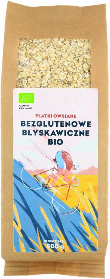 Składniki: Płatki owsiane bezglutenowe BIO 100%. Wartość odżywcza w 100g produktu: wartość energetyczna: 1450 kJ/ 340 kcal, tłuszcz: 6,5g, w tym kwasy tłuszczowe nasycone: 1g, węglowodany: 58g, w tym cukry: 1g, błonnik: 9g, białko: 13g, sól: 0,02g. Masa netto: 500g Właściwości i przeznaczenie: …