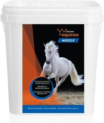 Equinox Muscle, masa mięśniowa Mówi się, że bez kopyt nie ma konia. To właśnie dzięki swojej biomechanice modulują nieprawidłowości podłoża, chroniąc stawy przez niewłaściwymi i nierównymi obciążeniami. Nieodpowiednia twardość, nawilżenie, brak sprężystości często powodują trudności w poruszaniu się oraz przyczyniają się do powstawania kontuzji. Żywienie jest istotnym czynnikiem w zdrowym wzroście kopyt oraz w utrzymaniu ich wytrzymałości i integralności. Kopyta do odpowiedniego funkcjonowania potrzebują energii, białka, witamin, minerałów oraz wody. Jeżeli występuje deficyt chociaż jednego z tych komponentów, to stan integralności struktury wytworu rogowego może być zagrożony. Mieszanka paszowa uzupełniająca Equinox Hooves wzbogacona o biotynę, cynk, miedź, magnez i mangan przeznaczona jest dla koni z problemami kopyt. Cynk oraz fosfor w obecności magnezu pełnią kluczową rolę w utrzymaniu zdrowej struktury. Natomiast wapń bierze udział w finalnej fazie rogu kopytowego, jej niedobór powoduje zmniejszenie elastyczności całej struktury. Produkt wspomaga regularny wzrost zdrowego rogu kopytowego, chroni przed pękaniem ścian oraz wzmacnia i odżywia całe kopyto. Dodatek witaminy C oraz jeżówki purpurowej o właściwościach przeciwzapalnych redukuje ryzyko infekcji w obrębie kopyta, oraz zapobiega gniciu strzałki kopytowej. Dodatek gryki w mieszance paszowej uzupełniającej Equinox Hooves wpływa na poprawę krążenia krwi w obrębie puszki kopytowej. Dawkowanie 8 g produktu na 100 kg masy ciała konia na dzień. Materiał paszowy: drożdże paszowe Yarrowia lipolytica (źródło witamin, aminokwasów, makro i mikroelementów oraz substancji biologicznie czynnych), susz jabłkowy, węglan wapnia, olej lniany, chelat magnezu, gryka, aromat owocowy. Dodatki paszowe: biotyna, chelat cynku, jeżówka purpurowa (Echinacea purpurea), witamina C (kwas L-askorbinowy), chelat miedzi, chelat manganu, selenin sodu. Skład ogólny Białko surowe 26,0%, Tłuszcz surowy 8,6%, Włókno surowe 1,5%, Sucha masa 95,0%, Popiół surowy 22,0% Makroelementy: Wapń 25,7 g/kg, Fosfor 9,8 g/kg, Magnez 1,6 g/kg, Sód 7,4 g/kg Mikroelementy (w 1kg) Żelazo 60,5 mg/kg, Miedź 2 413 mg/kg, Cynk 12 117 mg/kg, Mangan 1 765 mg/kg, Selen 4,5 mg/kg, Aminokwasy Lizyna 11,5 g/kg, Metionina 3,2 g/kg, Treonina 6,9 g/kg, Cystyna 2,5 g/kg, Seryna 5,1 g/kg, Prolina 6,8 g/kg, Glicyna 8,3 g/kg, Alanina 13,2 g/kg, Walina 9,8 g/kg, Leucyna 12,0 g/kg, Izoleucyna 8,3 g/kg, Tyrozyna 14,8 g/kg, Fenyloalanina 7,0 g/kg, Histydyna 3,7 g/kg, Arginina 7,5 g/kg, Kwas asparaginowy 15,1 g/kg, Kwas glutaminowy 20,8 g/kg Witaminy B2 16,5 mg/kg, B3 100,5 mg/kg, B5 49,3 mg/kg, B7 (Biotyna) 1 441 mg/kg, B9 (Kwas foliowy) 885 μg/kg, B12 4,1 μg/kg Zdrowie konia zaczyna się od kopyt