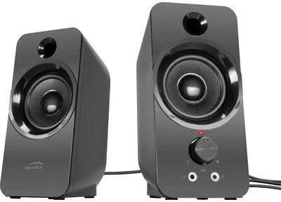 Głośniki stereo zasilane przez USB Długość kabla między satelitami: 1 m Dwie wtyczki jack 3,5 mm do podłączenia urządzeń audio Łączna regulacja głośności i pokrętło włączania/wyłączania Przednie słuchawki i gniazdo mikrofonowe. Czerwony wskaźnik LED stanu pracy Miękkie piankowe nóżki dla antypoślizgowego chwytania. Moc wyjściowa (rm): 6 W, moc szczytowa 12 W Sterowniki: 2 x 2,5 cala (6,35 cm) Częstotliwość: 150 Hz do 20 kHz
