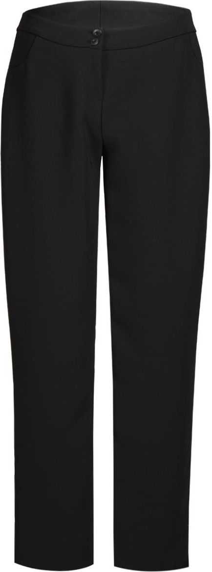 Eleganckie, czarne spodnie. Stan nie jest zbyt niski, zapewniający wygodę w użytkowaniu. Na przodzie imitacja kieszeni. Rozporek klasyczny, suwak zwykły. Zapinane na 2 guziki. Z tyłu karczek. Nogawki zwężające się ku dołowi. Bez kantu. W zestawieniu z naszym żakietem FZA643 stworzysz stylizację do …