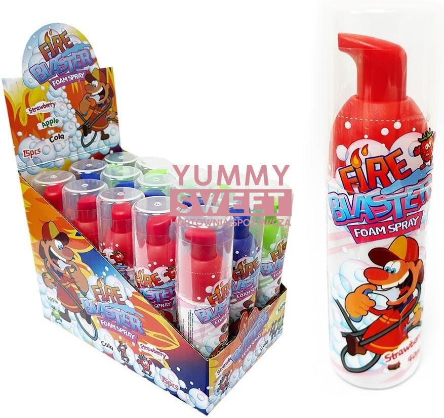 Spray gaśnica piankowa - Fire blaster Słodki spray, który po wyciśnięciu zamienia się w piankę. Mix smaków: cola, truskawka, jabłko Display zawiera 15 szt.