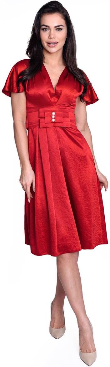 Fason: rozkloszowana, odcięta w pasie Dekolt przód: szpic Plecy: zabudowane Zapięcie: suwak kryty z boku Materiał: tkanina - satyna Długość całkowita: midi Rękaw: krótki, kimono Ozdoby: guziki