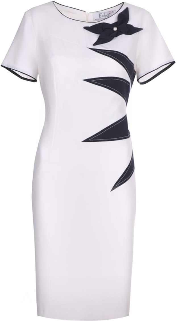 Fason: prosta, rozporek z tyłu Dekolt przód: okrągły Plecy: zabudowane Zapięcie: suwak kryty z tyłu Materiał: tkanina elastyczna krepa, podszewka Długość całkowita: midi Rękaw: krótki Ozdoby: guzik, stębnówki