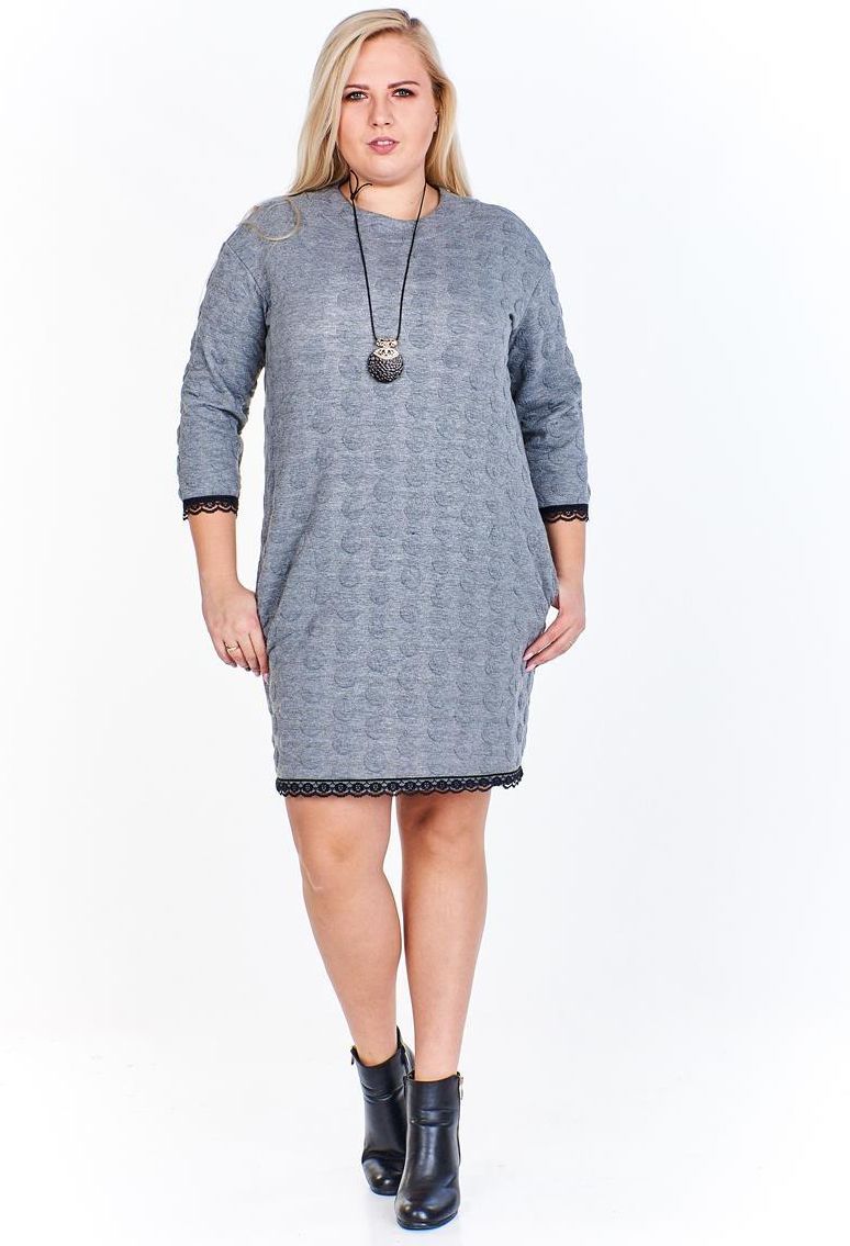 Prosta sukienka, nie ma zaznaczonej talii, jest w kształcie prostokąta. Doskonale tuszuje niedoskonałości sylwetki. Uszyta została z grubej, ciepłej dzianiny. Jest to pikówka z wytłaczanymi kółeczkami wykończona dodającą kobiecości koronką. Bez podszewki. Dekolt okrągły, podkreślony skórzana kokardką. Na biodrach funkcjonalne kieszenie. Rękawy długości 3/4. Sukienka codzienna, idealna na zimowe, chłodne dni. Została zaprojektowana z myślą o kobietach, w różnym wieku, chcącym wyglądać modnie i elegancko. PRODUKT POLSKI Kupując polskie marki wspierasz rozwój rodaków. Polska rośnie w siłę.