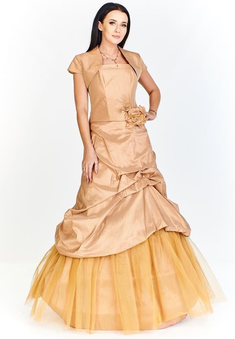 Fason: gorsetowa, rozkloszowana, halka stelaż Dekolt przód: gorsetowy Plecy: odkryte częściowo Zapięcie: sznurowanie z tyłu Materiał: tkanina - tafta, tiul Długość całkowita: maxi Rękaw: odkryte ramiona Ozdoby: kwiat