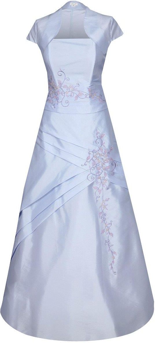 Fason: gorsetowa, rozkloszowana, halka stelaż Dekolt przód: gorsetowy Plecy: odkryte częściowo Zapięcie: sznurowanie z tyłu Materiał: tkanina - tafta, tiul Długość całkowita: maxi Rękaw: odkryte ramiona Ozdoby: haft