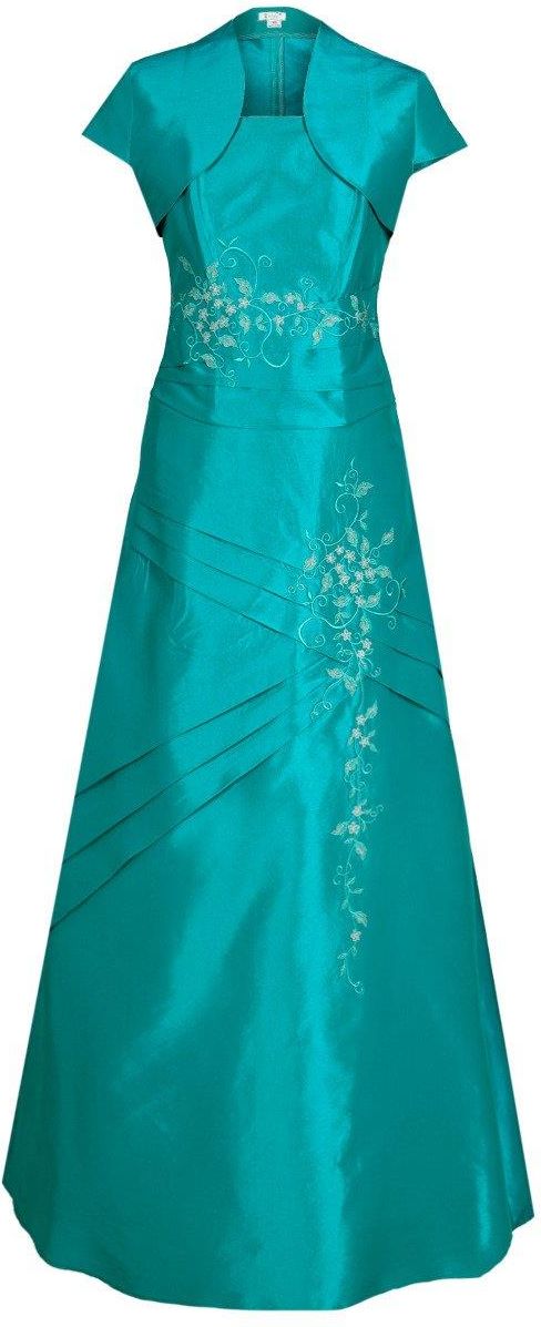 Fason: gorsetowa, rozkloszowana, halka stelaż Dekolt przód: gorsetowy Plecy: odkryte częściowo Zapięcie: sznurowanie z tyłu Materiał: tkanina - tafta, tiul Długość całkowita: maxi Rękaw: odkryte ramiona Ozdoby: haft