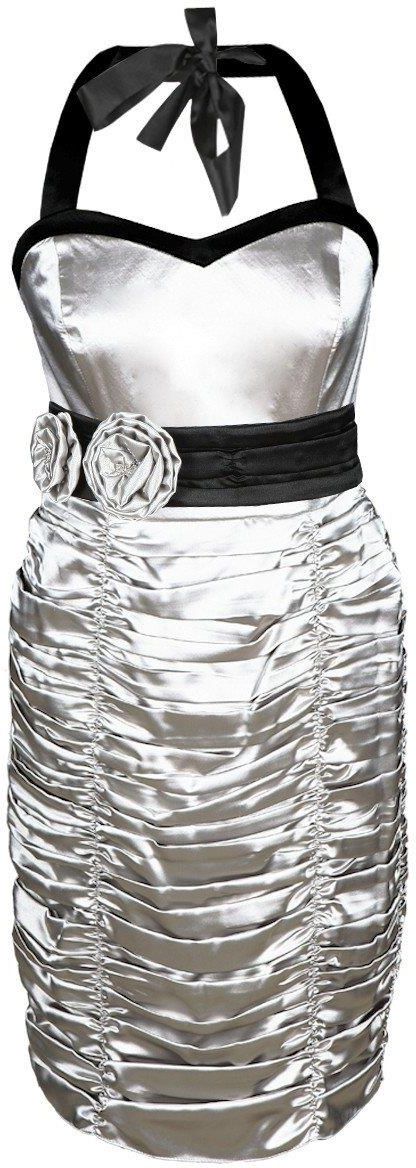 Fason: prosta, odcięta w pasie, pęknięcie z tyłu Dekolt przód: sercowe karo Plecy: odkryte częściowo Zapięcie: suwak kryty z tyłu Materiał: tkanina elastyczna - satyna, podszewka Długość całkowita: midi Rękaw: szerokie ramiączka Ozdoby: kwiat