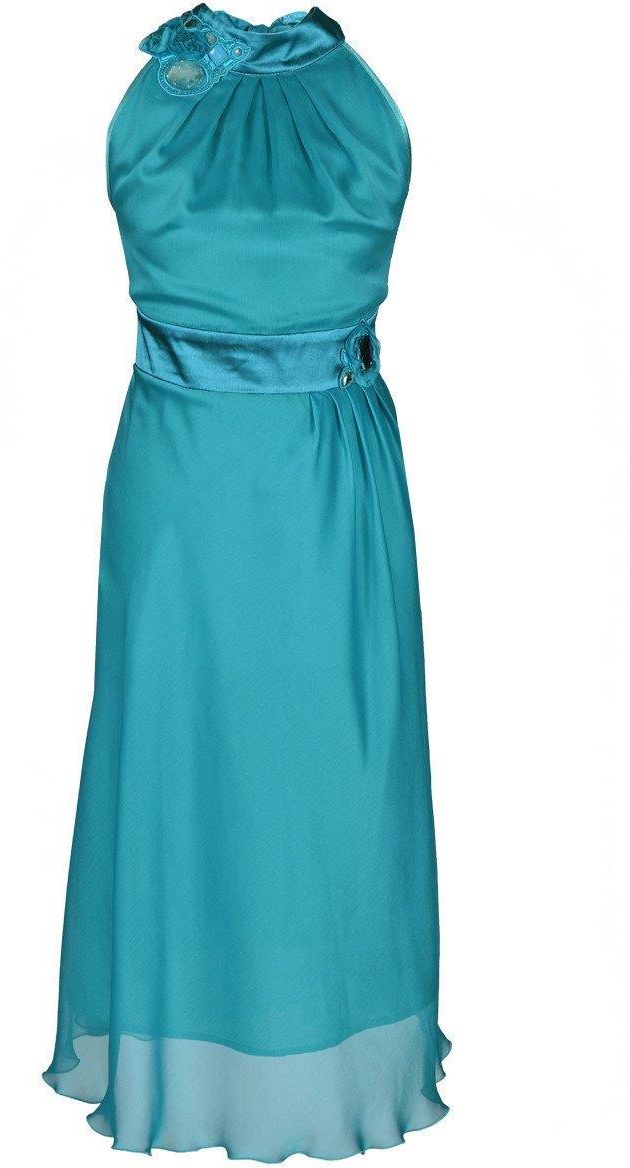 Fason: rozkloszowana, odcięta w pasie Dekolt przód: stójka Plecy: odkryte częściowo Zapięcie: suwak kryty z boku Materiał: tkanina zwiewna - szyfon, satyna, podszewka Długość całkowita: midi Rękaw: brak Ozdoby: haftowana aplikacja, kamienie