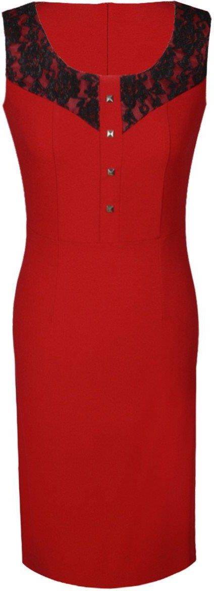 Fason: prosta, odcięta w pasie, rozporek z tyłu Dekolt przód: okrągły Plecy: zabudowane Zapięcie: suwak kryty z tyłu Materiał: tkanina elastyczna-krepa, koronka Długość całkowita: midi Rękaw: brak Ozdoby: ćwieki