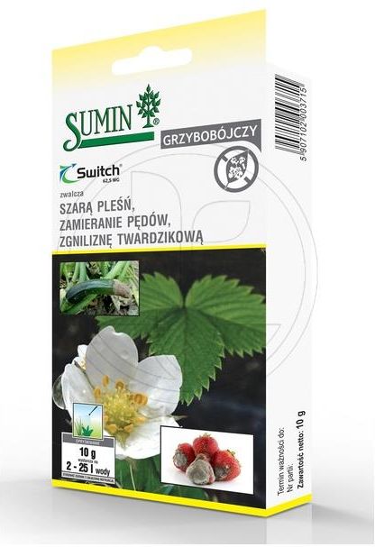 SWITCH 62,5 WG WAGA: 50 gram Zawartość substancji czynnych cyprodynil (związek z grupy anilinopirymidyn) – 375 g/kg środka (37,5%), fludioksonil (związek z grupy fenylopiroli) – 250 g/kg środka (25%). Switch 62,5 WG jest środkiem grzybobójczym, koncentratem w formie granul do sporządzania zawiesiny wodnej, o działaniu wgłębnym i powierzchniowym, do stosowania zapobiegawczego i interwencyjnego w zwalczaniu chorób jabłoni, gruszy, pigwy, czereśni, wiśni, śliwy, moreli, brzoskwini, nektarynki, truskawek, maliny, jeżyny, porzeczki czarnej, porzeczki czerwonej, porzeczki białej, borówki amerykańskiej, żurawiny, winorośli, fasoli szparagowej, fasoli na zbiór świeżych nasion, fasoli na suche nasiona, grochu zwyczajnego na świeże nasiona, grochu siewnego cukrowego, grochu jadalnego na suche nasiona, bobu, łubinu białego, łubinu żółtego, łubinu wąskolistnego, cebuli, szalotki, czosnku, cebuli z dymki, szczypiorku, salsefii, selera korzeniowego, marchwi, pietruszki korzeniowej, pasternaka, buraka ćwikłowego, chrzanu, brukwi, rzepy oraz uprawianych w gruncie, pod osłonami i w szklarni selera naciowego, cykorii sałatowej, endywii, botwinki, szpinaku, sałat liściowych i sałat głowiastych, roślin zielarskich i roślin ozdobnych oraz uprawianych pod osłonami i w szklarni pomidora, ogórka, bakłażana, cukinii, papryki. Środek Switch 62,5 WG przeznaczony jest do stosowania przy użyciu opryskiwaczy ręcznych. STOSOWANIE ŚRODKA ROŚLINY SADOWNICZE Jabłoń Gorzka zgnilizna, szara pleśń Maksymalna/zalecana dawka dla jednorazowego zastosowania: 7,5 g/100 m2. Termin stosowania: w ochronie jabłoni środek stosować od początku czerwca: – jednorazowo, przed zbiorem (na 4 dni). lub – dwukrotnie (na 14 i 4 dni przed zbiorem), w zależności od nasilenia choroby. Maksymalna liczba zabiegów w sezonie wegetacyjnym: 2. Odstęp pomiędzy zabiegami: 10 dni. Zalecana ilość wody: 6 l/100 m2. Zalecane opryskiwanie: drobnokropliste. Truskawka Szara pleśń Maksymalna/zalecana dawka dla jednorazowego zastosowania: 8,0 g/100 m2. Termin stosowania:Środek stosować zapobiegawczo lub z chwilą pojawienia się pierwszych objawów choroby, od początku do końca fazy kwitnienia truskawki. Liczba zabiegów: 3. Odstęp pomiędzy zabiegami: 10 – 14 dni. Zalecana ilość wody: 6–8 l/100 m2. Ilość wody dostosować do wielkości roślin i ich zagęszczenia. Zalecane opryskiwanie: drobnokropliste. Maksymalna liczba zabiegów w sezonie wegetacyjnym (z uwzględnieniem zastosowań małoobszarowych wymienionych w dalszej części etykiety): 3. Malina Szara pleśń, zamieranie pędów maliny Maksymalna dawka dla jednorazowego zastosowania: 10,0 g/100 m2. Zalecana dawka dla jednorazowego zastosowania: 8,0-10,0 g/100 m2. Wyższą dawkę środka stosować w warunkach większego zagrożenia chorobami. Termin stosowania:Środek stosować zapobiegawczo lub z chwilą pojawienia się pierwszych objawów chorób, od początku czerwca:– przeciwko szarej pleśni 3 razy w sezonie wegetacyjnym co 10 dni w fazie kwitnienia, od momentu pojawienia się 10% kwiatów, – przeciwko zamieraniu pędów maliny pierwszy zabieg wykonać przed kwitnieniem, w okresie, gdy nowe pędy osiągną wysokość 10-20 cm, następne zabiegi wykonywać co 10 dni – w fazie kwitnienia (początek kwitnienia, pełnia kwitnienia i koniec kwitnienia) orazpo zbiorze owoców i wycięciu starych pędów owoconośnych, w zależności od momentu wystąpienia choroby oraz od stopnia jej nasilenia. Liczba zabiegów: 2. Odstęp pomiędzy zabiegami: co najmniej 10 dni. Zalecana ilość wody: 7–10 l/100 m2. Ilość wody dostosować do wielkości i zagęszczenia roślin. Zalecane opryskiwanie: drobnokropliste. Maksymalna liczba zabiegów w sezonie wegetacyjnym (z uwzględnieniem zastosowań małoobszarowych wymienionych w dalszej części etykiety): 2. ROŚLINY WARZYWNE Fasola szparagowa Szara pleśń, zgnilizna twardzikowa, antraknoza fasoli Maksymalna dawka dla jednorazowego zastosowania: 10,0 g/100 m2. Zalecana dawka dla jednorazowego zastosowania: 8,0-10,0 g/100 m2. Wyższą dawkę środka stosować w warunkach większego zagrożenia chorobami. Termin stosowania:Środek stosować z chwilą wystąpienia pierwszych objawów chorób na roślinach. Maksymalna liczba zabiegów w sezonie wegetacyjnym: 2. Odstęp pomiędzy zabiegami: 10-14 dni. Zalecana ilość wody: 7 l/100 m2. Zalecane opryskiwanie: drobnokropliste. Groch zwyczajny uprawiany na świeże nasiona. Szara pleśń, zgnilizna twardzikowa, askochytoza Maksymalna dawka dla jednorazowego zastosowania: 10,0 g/100 m2. Zalecana dawka dla jednorazowego zastosowania: 8,0-10,0 g/100 m2. Wyższą dawkę środka stosować w warunkach większego zagrożenia chorobami. Termin stosowania:Środek stosować z chwilą wystąpienia pierwszych objawów chorób na roślinach, od początku kwitnienia grochu. Liczba zabiegów: 2. Odstęp pomiędzy zabiegami: 10-14 dni. Zalecana ilość wody: 7 l/100 m2. Zalecane opryskiwanie: drobnokropliste. Maksymalna liczba zabiegów w sezonie wegetacyjnym (z uwzględnieniem zastosowań małoobszarowych wymienionych w dalszej części etykiety): 2. Pomidor (w uprawie w szklarniowej) Szara pleśń Maksymalna/zalecana dawka dla jednorazowego zastosowania: 0,1% (10 g środka w 10 l wody). Termin stosowania: Środek stosować z chwilą wystąpienia pierwszych objawów choroby na roślinach. Liczba zabiegów: 3. Odstęp pomiędzy zabiegami: 7-14 dni. Zalecana ilość cieczy użytkowej: 10 l /100 m2. Zalecane opryskiwanie: drobnokropliste. Maksymalna liczba zabiegów w sezonie wegetacyjnym (z uwzględnieniem zastosowań małoobszarowych wymienionych w dalszej części etykiety): 3. Uwaga! Ze środków ochrony roślin należy korzystać z zachowaniem bezpieczeństwa. Przed każdym użyciem przeczytaj informacje zamieszczone na etykiecie i informacje dotyczące produktu. Kupujący oświadcza, iż spełnia warunki wymienione w art. 25 ust.3 ptk 5 ust