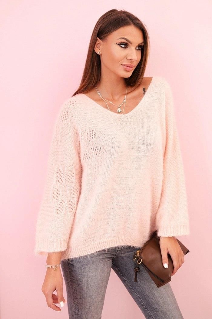 Sweter damski z moheru o luźnym kroju i dekolcie w serek pudrowy róż Łódź