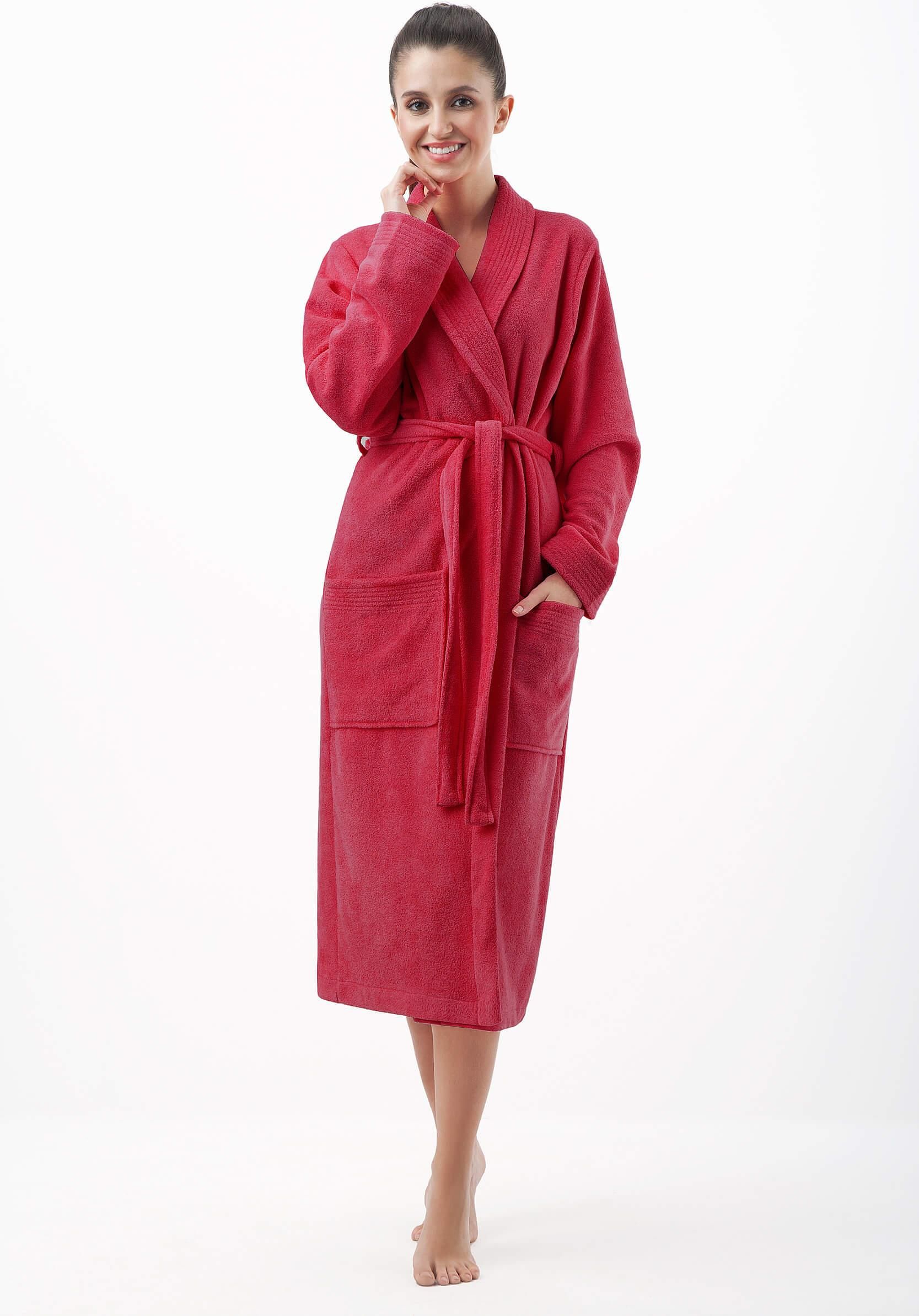 Ciepły szlafrok damski z przyjemnej i otulającej dzianiny. Bordowy to ulubiony kolor wielu pań. Dodaje pewności siebie, energii do działania, a przede wszystkim pasuje do wielu innych kolorów. Miękka i przyjemna w dotyku dzianina to wspaniałe rozwiązanie dla każdej kobiety. Model posiada głębokie, naszywane kiszenie i długie rękawy, które zostały wykończone ozdobnym przeszyciem. To samo zdobienie znajduje się na całej długości dekoltu i brzegu szlafroka. Szlafrok jest nie tylko w modnym kolorze, posiada też uniwersalny krój, który świetnie układa się na każdej sylwetce. Szlafrok damski z długimi rękawami sprawdzi się jesienną i zimową porą. Jednak wiele pań wykorzystuje go również w chłodniejsze wieczory latem. Serdecznie zapraszamy do zapoznania się z pełną ofertą piżam i koszulek nocnych, by móc stworzyć swój indywidualny zestaw. Zalecenia producenta: - Nie czyścić chemicznie - Maksymalna temperatura prania: 40°C - Nie chlorować - Nie suszyć w suszarce bębnowej - Temperatura pracowania do 110°C Skład surowcowy: 80% bawełna, 20% poliester Producent: LUNA Kolor: bordowy