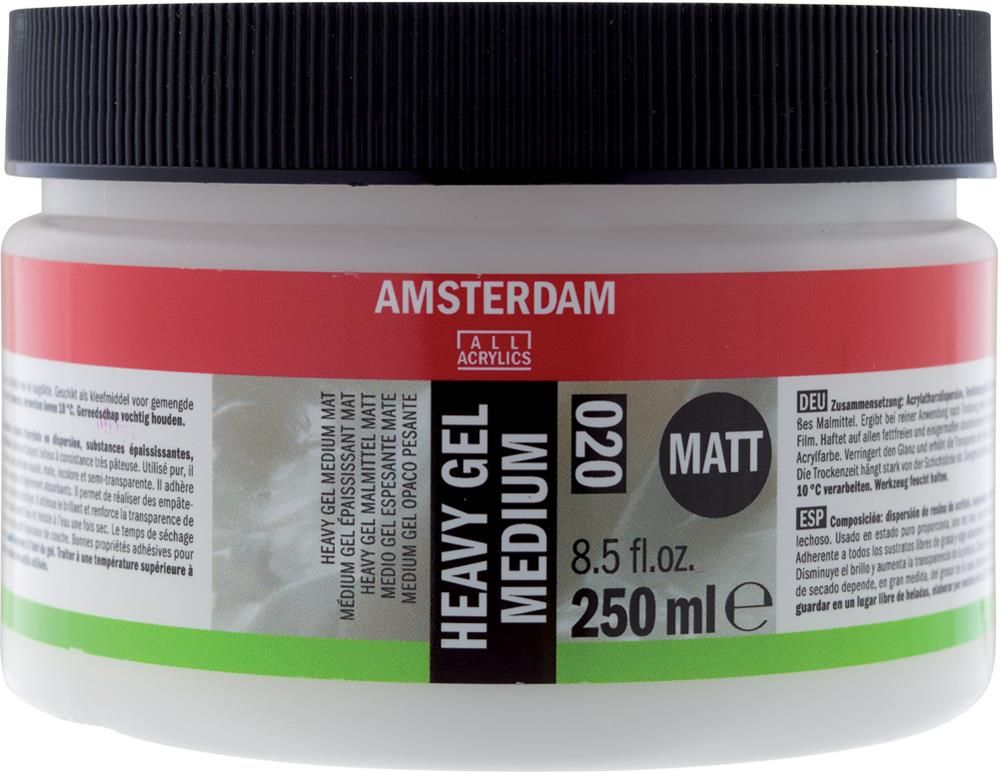 Talens Amsterdam Heavy Gel Medium Matt gęste błyszczące medium żelowe przeznaczone do farb akrylowychzmniejsza połysk oraz poprawia transparentność oraz lepkość farb, a także zwiększa widoczność pociągnięć pędzla - możliwe jest nałożenie dosyć grubej warstwy farby już za pierwszym razem. Idealnie nadaje się do techniki impastoma właściwości klejące, co pozwala na łączenie z różnymi rodzajami materiałów, takimi jak piasek, tektura, drewnoposiada mleczną, gęstą konsystencję, która po wyschnięciu staje się bezbarwnaczas schnięcia uzależniony jest od grubości nałożonej warstwystworzone zostało na bazie żywicy akrylowej i substancji zagęszczających, składnik matujący (krzmionka)stosować w tepmperaturze powyżej 10 stopni; chronić przed mrozem pojemność: 250 ml produkt holenderskiej firmy Talens