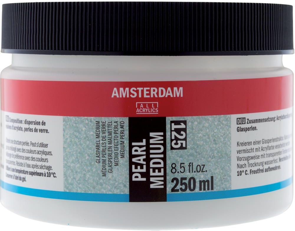 Talens Amsterdam Pearl Medium do efektów służy uzyskanie perłowej struktury skład: dyspersyjna żywica akrylowa, perełki szklane najlepiej mieszać z przezroczystymi kolorami możliwość stosowania samodzielnie lub zmieszać z farbą akrylową stosować w temperaturze powyżęj 10oC po wyschnięciu powlóka wodoodporna pojemność: 250 ml produkt holenderskiej firmy Talens