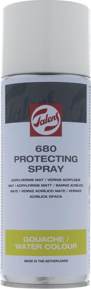 Talens Protecting Werniks ochronny skład: żywica akrylowa rozpuszczona w m. in. białym spirytusie uniwersalny, szybkoschnący, transparentny nie żółknący werniks grubość warstwy decyduje o natężeniu połysku (im grubsza warstwa tym większy efekt połysku) uodparnia farby akwarelowe na działanie wilgoci powoduje, że matowe farby są bardziej transparentne. pojemność: 400ml spray produkt holenderskiej firmy Talens