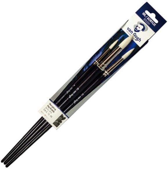 Pędzle do farb olejnych i akrylowych szczecinowe Van Gogh seria 210 - 3 szt. nr 8, 12, 16 Royal Talens Zestaw starannie wykonanych i ręcznie ukształtowanych pędzli do olejów i akrylu. Mają elastyczne i odporne na zużycie włosie. Wykonano je z włosia wieprzowego. Szczecina jest długa i posiada naturalną twardość, co umożliwia nasiąkanie farby. Takie włosie idealnie nadaje się do mniej gęstej techniki malarstwa akrylowego i olejnego. Pędzle są płaskie, dzięki czemu można tworzyć ostre krawędzie i proste linie. Zestaw zawiera 3 okrągłe pędzle szczecinowe: nr 8 o średnicy 5.7 mm, nr 4 o średnicy 8.1 mm, nr 6 o średnicy 11.2 mm.