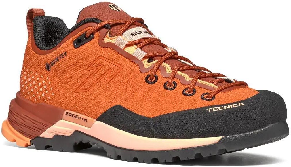 Buty podejściowe damskie Tecnica Sulfur S GTX - progressive orange/dark red to model o anatomicznym kształcie, który zapewnia idealne wsparcie stopy, właściwości wodoodporne i dobrą trakcję na różnym podłożu. Zaprojektowane dla najbardziej wymagających użytkowników, którzy w górach nie idą na kompromisy. Buty podejściowe damskie Tecnica Sulfur S GTX - progressive orange/dark red to model, którego cholewka jest zbudowana i ukształtowana wokół anatomicznego kopyta, które zapewnia idealne dopasowanie. Model zapewnia trzymanie i wsparcie przedniej części stopy i pięty nawet w najtrudniejszym terenie. Buty zostały wykonane z materiału balistycznego, który zapewnia wytrzymałość całości. Cholewka wykorzystuje także zalety membrany GORE-TEX® Extended Comfort. Dzięki niej opady nie spowodują przemoczenia obuwia. Krople deszczu nie są w stanie wniknąć przez mikroporowatą konstrukcję laminatu. Całości została ponadto skonstruowana w taki sposób, aby zapewniać oddychalność i sprawnie odprowadzać wilgoć tworzącą się w bucie na zewnątrz. Adaptive Shape Technology to system łączący amortyzację pianki EVA o różnej gęstości użytej w śródpodeszwie z wkładką Ortholite®. Dzięki czemu konstrukcja buta dopasowuje się do kształtu Twojej stopy. Buty podejściowe damskie Tecnica Sulfur S GTX - progressive orange/dark red mają podeszwę zewnętrzną wykonaną z gumy Vibram® Megagrip®. Zapewnia ona przyczepność zarówno na suchych, jak i mokrych nawierzchniach. Wielokierunkowy wzór wypustek jest zaprojektowany do pokonywania różnych terenów w zmieniających się warunkach. Pod łukiem stopy podeszwa ma specjalnie zaprojektowane wypustki zwiększające przyczepność i wspierające łuk stopy. Strefa climbing zone przy palcach daje precyzję palców na płytach i krawędziach, co czyni ją idealnym wyborem na bardziej strome i techniczne podejścia. Cholewka przy palcach ma klejony, gumowy otok, który chroni ją przed uszkodzeniami spowodowanymi otarciami lub uderzeniami w skały, lub korzenie. Precyzyjny system wiązania, zaczerpnięty z butów wspinaczkowych, pozwala na idealne dopasowanie cholewki do stopy. Tasiemka z tyłu modelu ułatwia zakładanie i daje możliwość przypięcia do uprzęży wspinaczkowej. Buty Tecnica Sulfur S GTX - progressive orange/dark red - najważniejsze cechy:Membrana GORE-TEX® Extended Comfort zapewnia wysoki poziom wodoodporności;GORE-TEX® pozwala na zachowanie dobrej oddychalności modelu;Sprawne odprowadzanie wilgoci na zewnątrz modelu;Cholewka wykonana z wytrzymałego materiału syntetycznego;Model oparty na anatomicznym kopycie;Adaptive Shape Technology to idealne dopasowanie do anatomii Twojej stopy;Klasyczny system sznurowania;Wewnętrzna wkładka Ortholite®;Płytka Edge Frame™ w podeszwie to wsparcie stopy i elastyczność;Śródpodeszwa z pianki Eva o podwójnej gęstości to dobra amortyzacja;Profil podeszwy pozwala na łatwiejsze przetaczanie stopy;Podeszwa Vibram® Megagrip® zapewnia dobrą przyczepność;Klejony, gumowy otok przy palcach;Strefa climbing zone przy palcach;Podeszwa pod łukiem stopy ma specjalnie zaprojektowane wypustki zwiększające przyczepność;Pętla Backloop to szybie i łatwe zakładanie buta, z możliwością dopięcia do uprzęży wspinaczkowej.
