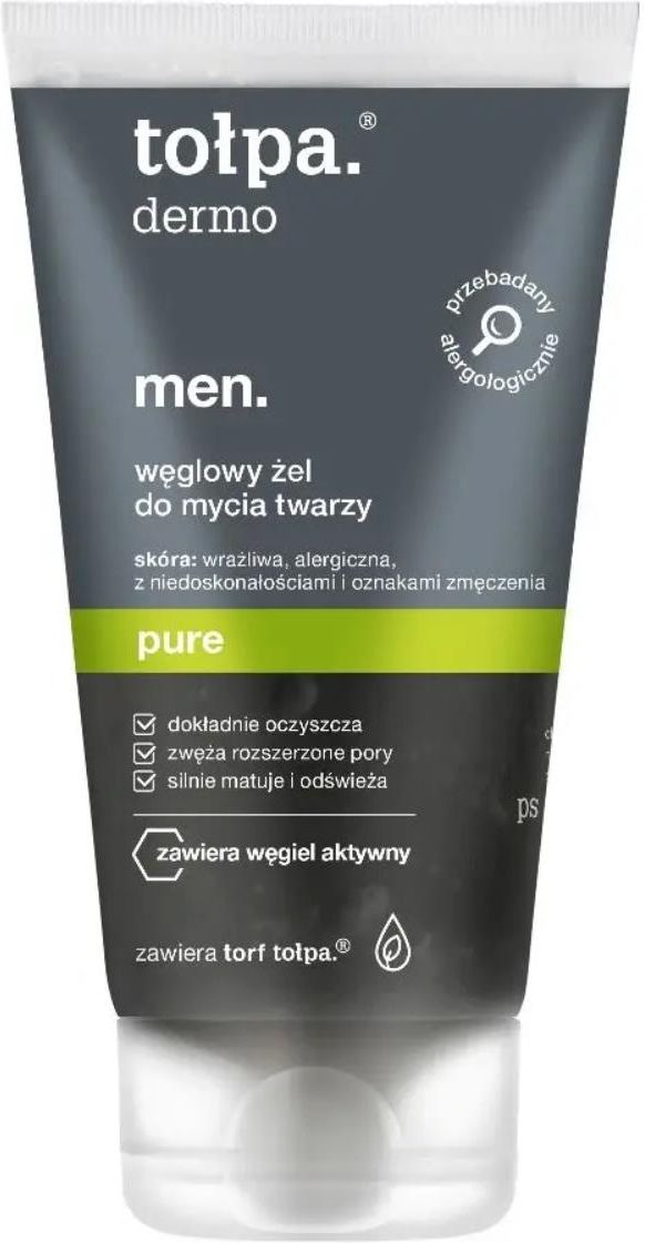 Tołpa Dermo Men Pure Węglowy Oczyszczający Żel Do Mycia Twarzy Męski 150ml Matujący żel do twarzy dla mężczyzn Żel do twarzy dla mężczyzn Tołpa dokładnie oczyszcza skórę z zanieczyszczeń, nadmiaru sebum, potu i kurzu. Zwęża rozszerzone pory i zapobiega powstawaniu niedoskonałości.Reguluje wydzielanie sebum i matuje. Łagodzi podrażnienia i zaczerwienienia powstałe w wyniku golenia. Przywraca komfort, eliminuje efekt ściągniętej i wysuszonej skóry. Pozostawia ją świeżą i pełną energii. Składniki aktywne węgiel – detoksykuje, działa przeciwtrądzikowo, redukuje wydzielanie sebum, oczyszcza hialuronian sodu – wiąże wodę w naskórku, stanowi rezerwuar wilgoci i utrzymuje właściwe nawilżenie skóry, tworzy na skórze niewidoczny film ochraniając ją przed czynnikami zewnętrznymi, pozostawia efekt gładkiej skóry Zalety dokładnie oczyszcza zwęża rozszerzone pory silnie matuje i odświeża Skład: Aqua, Disodium Cocoamphodiacetate, Polysorbate 20, Poloxamer 184, Propylene Glycol, Acrylates/C10-30 Alkyl Acrylate Crosspolymer, Peat Extract, Sodium Hyaluronate, Glycerin, Charcoal Powder, Polyglyceryl-10 Stearate, Polyglyceryl-10 Myristate, Polyglycerin-10, Sodium Dehydroacetate, Citric Acid, Sodium Chloride, Disodium EDTA, Xanthan Gum, Sodium Hydroxide, Parfum, Benzyl Alcohol, Salicylic Acid, Sorbic Acid, Methylpropanediol, Ethylhexylglycerin, Phenoxyethanol, Caprylyl Glycol, Benzoic Acid.