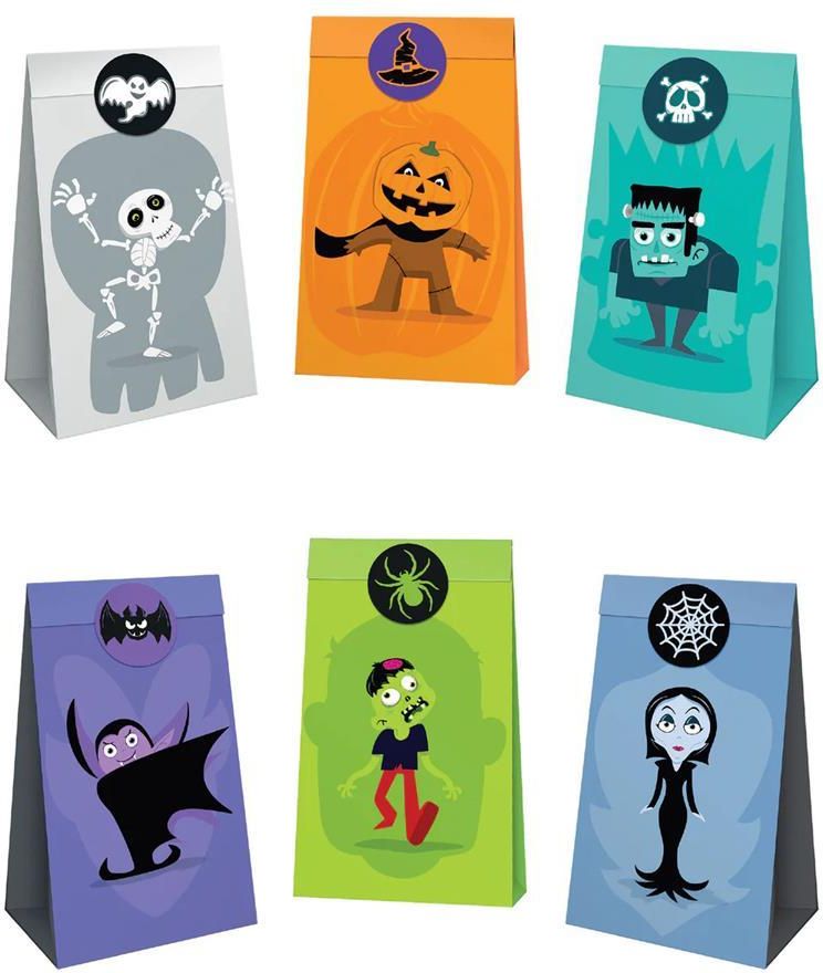 Torebki na cukierki z motywem Halloween to pomysł na drobny upominek np. dla gości na przyjęciu. Do torebek można spakować do niego drobne smakołyki lub gadżety i wręczyć małym gościom na przyjęciu halloweenowym. Świetne do niewielkich upominków również dla dzieci w przedszkolu / szkole. Komplet = 6 torebeczek, każda z inną postacią - o wymiarach 11 x 18 x 6 cm.