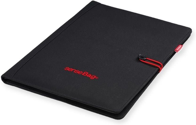 Sztywna, solidna oprawa. Szczelina na blok. Kieszeń na luźne kartki. 3 gumki do trzymania przyborów. Czarna tkanina poliestrowa.