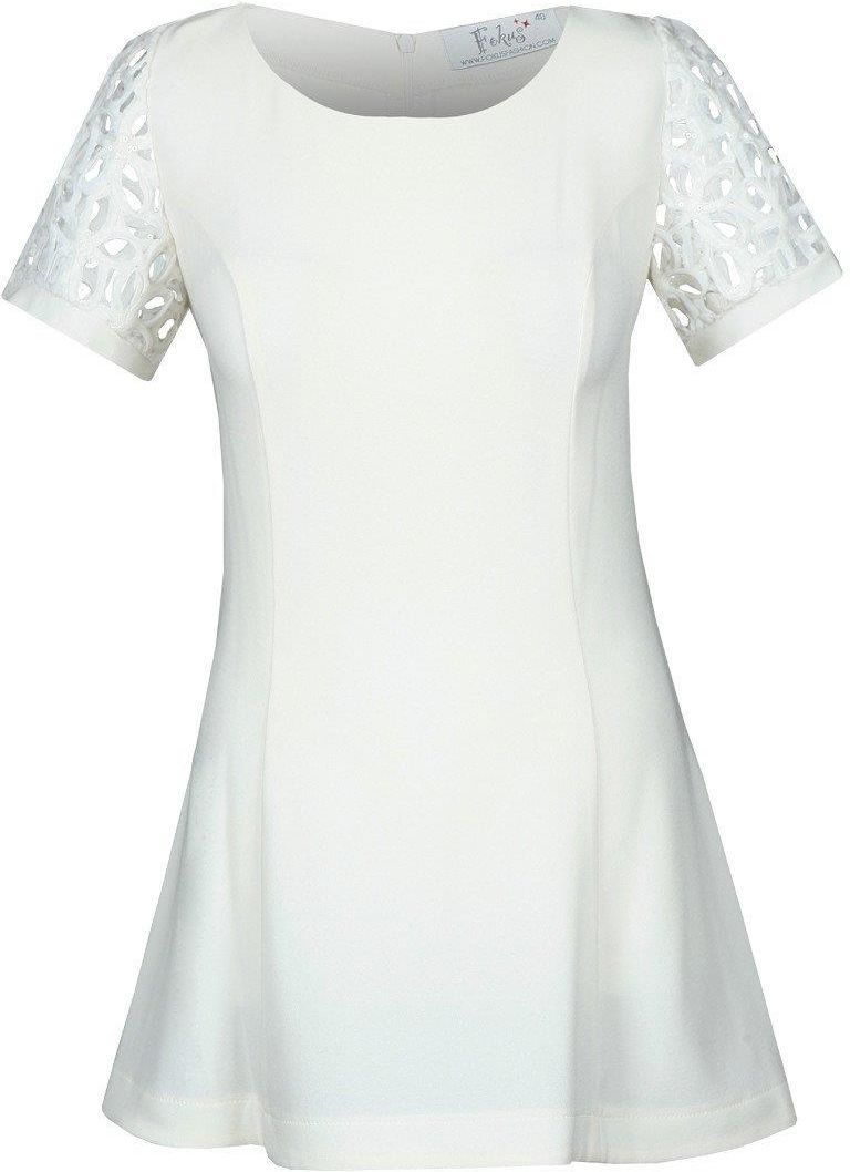Tunika poszerzana dołem. Dekolt okrągły. Na przodzie cięcia francuskie. Rękaw krótki, uszyty z ozdobnej koronki, wykończony wąskim mankietem. Z tyłu zaszewki i suwak kryty. Tunika świetnie komponuje się z legginsami. Polecamy na codzienne letnie dni. PRODUKT POLSKI Kupując polskie marki wspierasz rozwój rodaków. Polska rośnie w siłę.