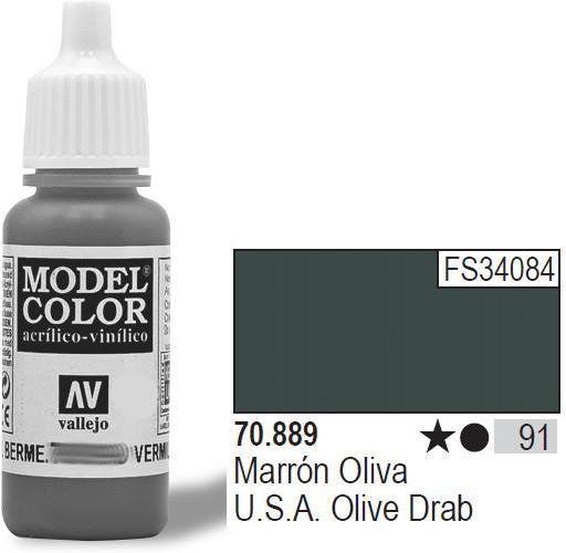 Vallejo 70889 Olive Brown Model Color Farba Odpowiedniki: (uwaga, kolor może być przybliżony) FS 34084 Gunze 78 Humbrol 66 Revell 66 Tamiya XF62 Testor 1711 Pojemność: 18ml Rodzina kolorów: Brązowy Farba w sprayu: Nie Wykończenie: matowe Farba w postaci markera: Nie Kolekcja: Vallejo Model Color