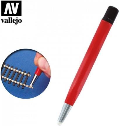 Pędzel z włókna szklanego (4mm) marki Vallejo Ten pędzel z włókna szklanego jest idealny do dokładnego i szybkiego czyszczenia, usuwania rdzy i przygotowywania powierzchni różnych materiałów. Końcówka pędzla jest regulowana pokrętłem - więcej lub mniej wysuniętych włókien szklanych. Im mniej wysuniętych włókien, tym pędzel działa bardziej ściernie.