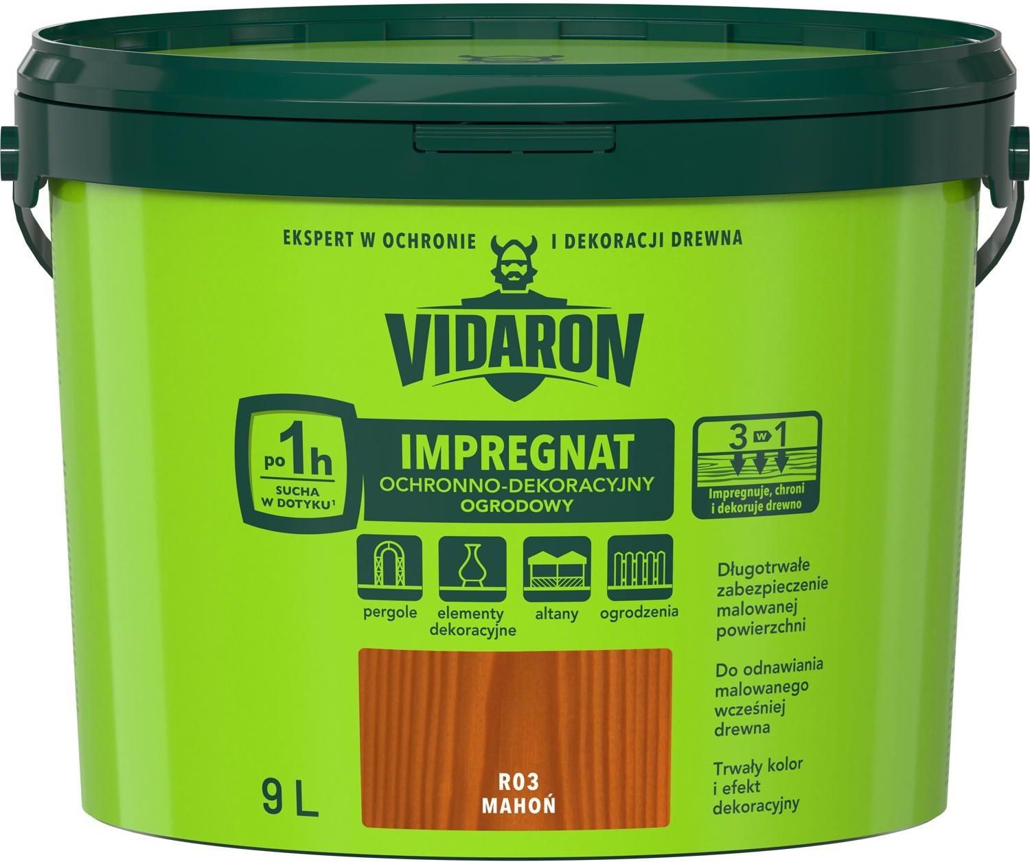 VIDARON IMPREGNAT OCHRONNO-DEKORACYJNY OGRODOWY R03 Mahoń 9L Impregnat Ochronno-Dekoracyjny Ogrodowy to produkt, który impregnuje, chroni i dekoruje drewno. Dodatkowo impregnat długotrwale zabezpiecza malowaną powierzchnię oraz zapewnia trwały kolor i efekt dekoracyjny. Charakteryzuje się wczesną odpornością malowanej powierzchni na deszcz oraz szybkim¹ wysychaniem - powierzchnia sucha w dotyku już po 1 h. Główne cechy produktu 3w1 impregnuje, chroni i dekoruje drewno Sucha w dotyku¹ po 1h Długotrwałe zabezpieczenie malowanej powierzchni Do odnawiania malowanego wcześniej drewna Trwały kolor i efekt dekoracyjny Dobór produktu Polecany do ochronno-dekoracyjnego malowania powierzchni drewnianych, szczególnie architektury ogrodowej, np. pergole, drewniane elementy dekoracyjne, altany, ogrodzenia i bramy.  Produkt nie jest przeznaczony do impregnowania drewnianych podłóg, schodów, tarasów itp. ciągów komunikacyjnych. W przypadku nietypowych zastosowań (np. materiały drewniane stosowane w dekarstwie, egzotyczne gatunki drewna, okładziny korkowe, itp.) użycie wyrobu należy skonsultować z Producentem. Produkt nie jest przeznaczony do impregnowania drewnianych dachów oraz gontu. Ze względu na obecność wosku hydrofobizującego w składzie Impregnatu nie zalecamy nakładania na powierzchnię Impregnatu wyrobów nawierzchniowych (lakiery, emalie itp.). Nie zalecamy nakładania impregnatu na powierzchnie wcześniej olejowane lub bejcowane. Wydajność do 10 m²/l przy jednokrotnym malowaniu.