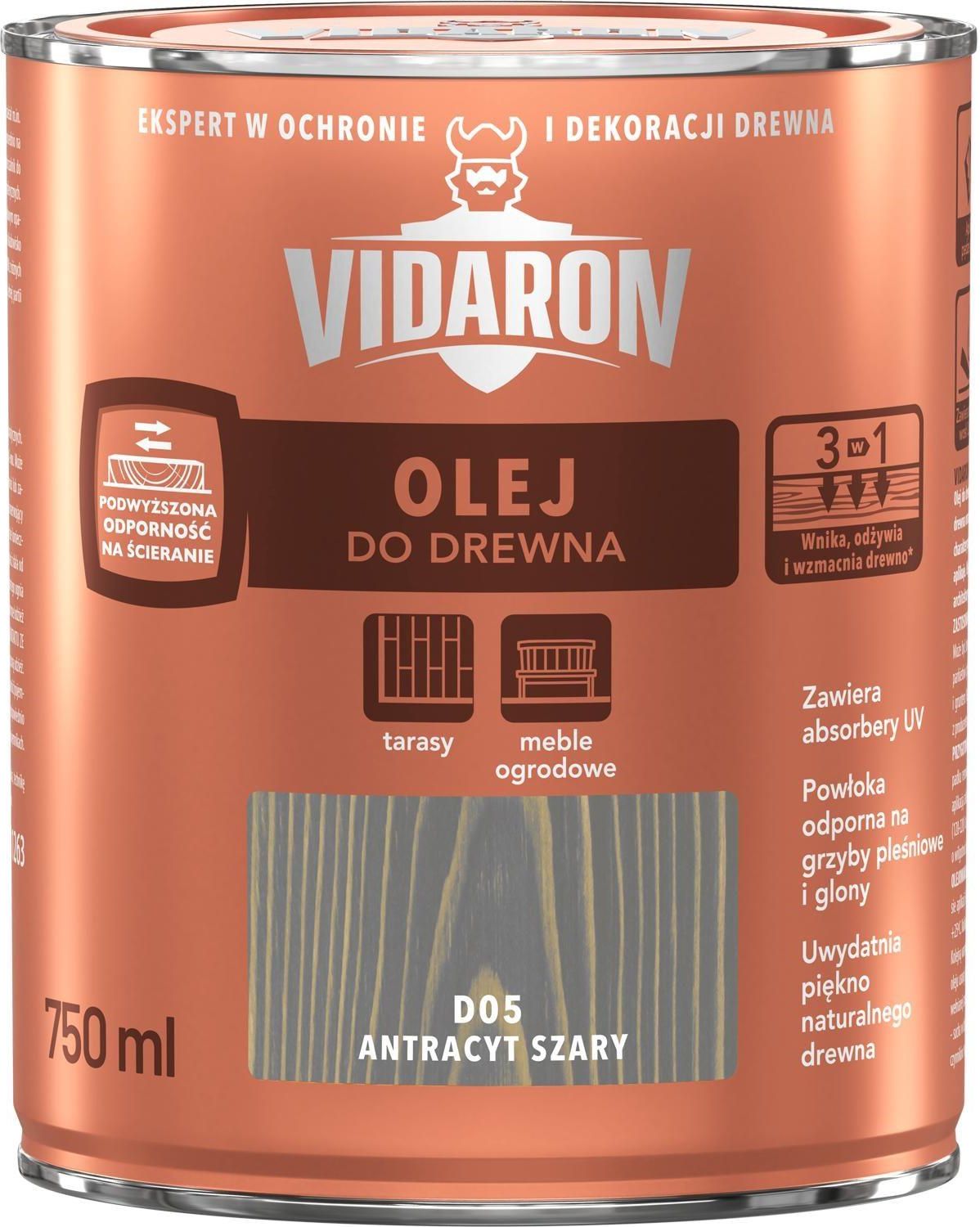 VIDARON Olej Do Drewna Pojemność: 0,75L | Kolor: D05 antracyt szary | Efekt wykończenia: mat ZASTOSOWANIE Drewno Altana Meble ogrodowe Pergola Drewutnia Meble wewnątrz pomieszczeń Boazeria Elementy elewacji drewnianej DOSTĘPNE KOLORY D01 bezbarwny D02 teak naturalny D03 iroko egzotyczne D04 …