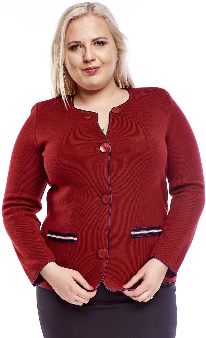 Klasyczny kardigan wykonany z prążkowanej dzianiny sweterkowej. Przód oraz rękawy zostały wykończone taśmą satynową. Na linii tali naszyte są szerokie taśmy a'la kieszenie. Sweterek jest zapinany na 4 guziki . Na ramionach są wszyte poduszki. Sweterek idealny na co dzień, spotkania rodzinne oraz świąteczne. Może być używany jako narzutka na sukienkę, bluzką a także jako samodzielny sweterek do spódnicy lub spodni. Skład materiału: 50% akryl, 30% wełna, 20% poliamid PRODUKT POLSKI Kupując polskie marki wspierasz rozwój rodaków. Polska rośnie w siłę.