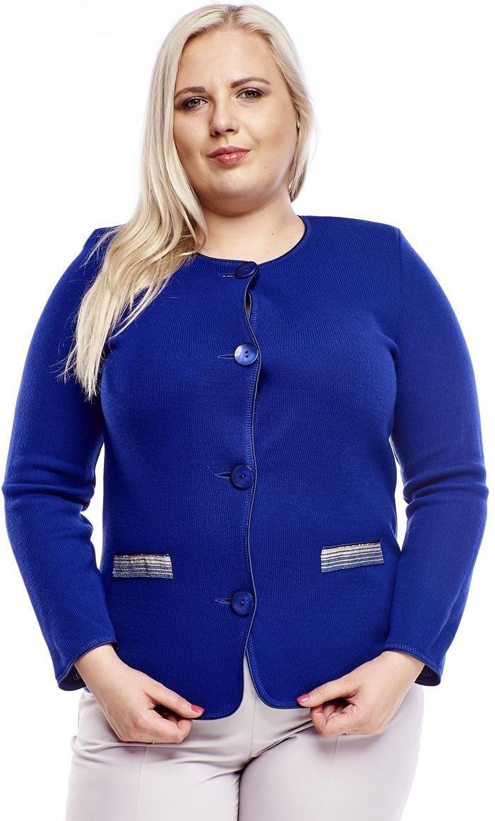Klasyczny kardigan wykonany z prążkowanej dzianiny sweterkowej. Przód oraz rękawy zostały wykończone taśmą satynową. Na linii tali naszyte są szerokie taśmy a'la kieszenie. Sweterek jest zapinany na 4 guziki . Na ramionach są wszyte poduszki. Sweterek idealny na co dzień, spotkania rodzinne oraz świąteczne. Może być używany jako narzutka na sukienkę, bluzką a także jako samodzielny sweterek do spódnicy lub spodni. Skład materiału: 50% akryl, 30% wełna, 20% poliamid PRODUKT POLSKI Kupując polskie marki wspierasz rozwój rodaków. Polska rośnie w siłę.