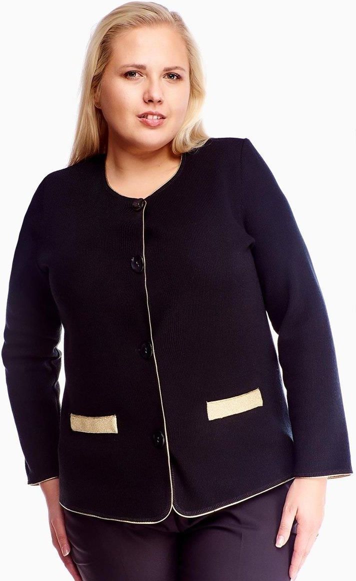 Klasyczny kardigan wykonany z prążkowanej dzianiny sweterkowej. Przód oraz rękawy zostały wykończone taśmą satynową. Na linii tali naszyte są szerokie taśmy a'la kieszenie. Sweterek jest zapinany na 4 guziki . Na ramionach są wszyte poduszki. Sweterek idealny na co dzień, spotkania rodzinne oraz …