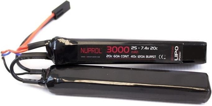 Akumulator LiPo 3000mAh 7.4V 20C - dwudzielny Nowa seria najwyższej jakości akumulatorów typu LiPo produkcji WE Airsoft Europe wychodzi naprzeciw potrzebom każdego airsoftowca. Znajdziemy w niej całą gamę akumulatorów różnych typów i rozmiarów, nadających się do wszelkich rodzajów replik airsoftowych o napędzie elektrycznym. Akumulatory WE Airsoft Europe są bardzo wydajne oraz charakteryzują się długą żywotnością. Pakiety litowo-jonowo-polimerowe ( LiPo ) to następcy znanych pakietów litowo-jonowych ( LiIon ). Podstawową zaletą akumulatorów LiPo jest niewątpliwie stosunek pojemności do wielkości. Są bardzo małych gabarytów przy jednoczesnym zachowaniu bardzo dużej wydajności prądowej, co pozwala dobrać odpowiedni pakiet praktycznie do każdej repliki AEG. Nie posiadają efektu pamięci. Mogą być ładowane bardzo często, bez wcześniejszego rozładowania. Częste ładowanie jest korzystne dla tego rodzaju akumulatora. Należy pamiętać aby pakietu LiPo nie rozładować poniżej 3V na ogniwo oraz nie przeładować powyżej 4,2V na ogniwo. Kolejną zaletą pakietów LiPo jest mały procentowy stopień samorozładowania. Nie używany pakiet w skali miesiąca traci około 3-5% energii. Należy pilnować pakietu, gdyż podczas bardzo długiego przechowywania może dojść do rozładowania poniżej dopuszczalnej wartości minimalnej ( 3V na ogniwo ) i nieodwracalnych reakcji chemicznych, które mogą spowodować pogorszenie właściwości pakietu włącznie z jego trwałym uszkodzeniem, w ekstremalnych przypadkach – zapłonem. Nieużywany pakiet LiPo powinien być naładowany średnio w około 70%. Przy prawidłowej eksploatacji żywotność pakietów LiPo wynosi średnio 500-700 cykli. Istotnym aspektem jest temperatura w jakiej mogą pracować pakiety LiPo. W odróżnieniu od pozostałych akumulatorów, ogniwa LiPo dobrze radzą sobie w niskich temperaturach. Ładowane powinny być natomiast w temperaturze pokojowej. Aby zachować dobrą kondycję akumulatorów LiPo należy je podczas ładowania balansować przy pomocy wtyku serwisowego, który posiada większość pakietów LiPo ( dobra ładowarka LiPo ma wbudowany balancer ).