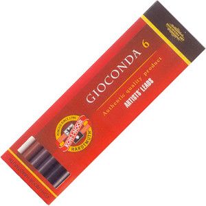 WKŁAD DO OŁÓWKA 5,6 mm 4869/05 przy rysunkach o dużych formatach pożądane są wkłady Gioconda grubość 5,6 mm/ 120 mm W zestawie wkłady: 4345/2 - pastel czarny, 8673/2 - węgiel prasowany, twardość 2- średni, 4378 - pastel sepia ciemna, 4377 - pastel sepia jasna, 4373 -pastel sangwina, 4371 - biały pastel przeznaczone są do ołówków automatycznych : 5301 Mephisto 5347 Versatil 5340 ilość: 6 sztuk