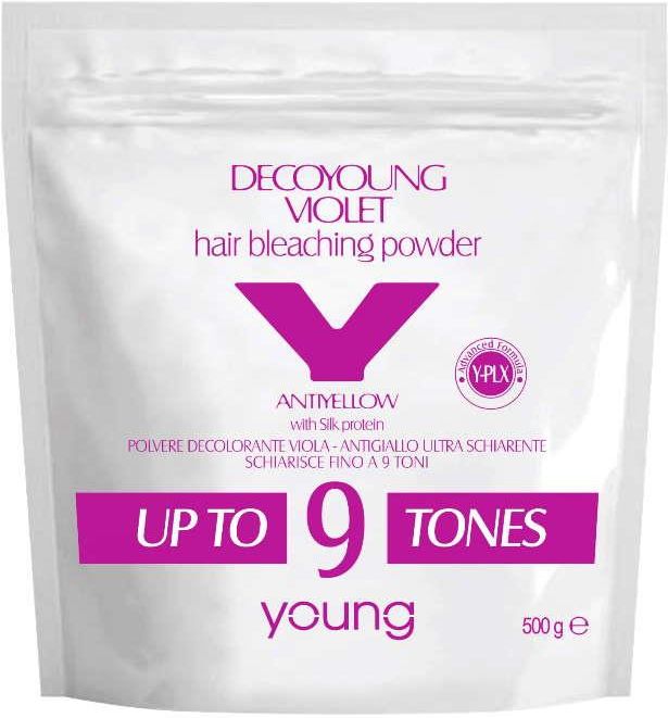 Rozjaśniacz Young Decoyoung Violet to fioletowy proszek rozjaśniający z efektem przeciwdziałającym żółknięciu z dodatkiem białka jedwabiu i formuły Y-PLEX.Produkt neutralizuje żółtawe odcienie za pomocą fioletowych pigmentów, zalecany do doskonałego i całkowitego rozjaśnienia, a także do różnych technik rozjaśniania.Dzięki swojemu zastosowaniu rozjaśnia aż o 9 odcieni.Dzięki formule PLEX pielęgnuje włosy i jest łatwy w aplikacji. Sposób użycia W niemetalowej miseczce równomiernie wymieszaj porcję proszku rozjaśniającego z oksydantem 10-20-30-40 vol. w proporcji 1:2 (np. 50 ml farby + 100 ml utleniacza). Nałożyć mieszankę na suche włosy i pozostawić na 30 minut, w przypadku dużej ilości siwych włosów przedłuż czas trzymania mieszanki do 40 minut.