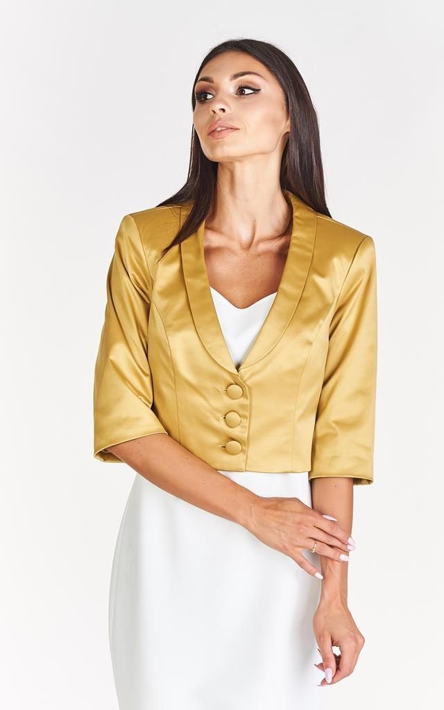 Weselna kreacja już kupiona, szykuje się nie lada wyjście? dopełnieniem każdej stylizacji jest marynarka, żakiet lub bolerko. Sprawdzi się, gdy zajdzie potrzeba przykryć ramiona lub gdy na dworze nieco chłodniej. Krótki żakiet bardzo elegancki idealny na wszelkie okoliczności. W pracy lub na spotkaniu biznesowym będzie stroił z każdą małą czarną. Materiał lekko połyskujący, satyna w jednolitym kolorze. Z tego samego materiału do kompletu, również w sprzedaży mamy sukienkę FSU921 PRODUKT POLSKI Kupując polskie marki wspierasz rozwój rodaków. Polska rośnie w siłę.
