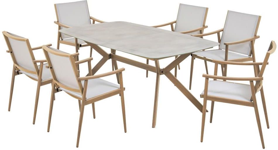 Zestaw mebli jadalnianych Napa dla 6 osób stylowy zestaw mebli ogrodowych jadalnianych, który pomieści rodzinę lub przyjaciół, zapewniając komfort podczas wspólnych posiłków na świeżym powietrzu trwała konstrukcja z aluminium, odporna na warunki atmosferyczne i korozję, gwarantuje długą żywotność …