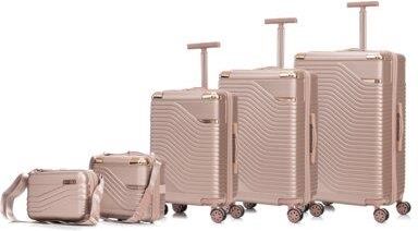 Zestaw SEMI LINE składający się z trzech walizek w rozmiarach: 20 cali, 24 cale, 28 cali oraz kosmetyczki w rozmiarze 14 cali i torebki.