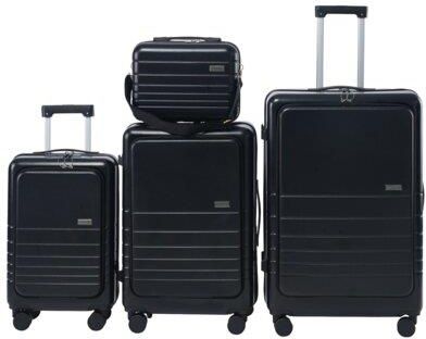 Zestaw walizek ABS. W rozmiarach 20"/ 24"/ 28 oraz kosmetyczki w rozmiarze 14" Wygodny uchwyt górny i raczka teleskopowa z uchwytem na telefon przy wszystkich rozmiarach. Uchwyt boczny i stopki boczne przy rozmiarach 24"/28". 4 podwójne obrotowe kółka . Zamek szyfrowy. Z przodu kieszeń na łaptop w środku kabel USB. Z tyłu walizki uchwyt na kubek. Wew. Komora zamykana na suwak , dodatkowa kieszeń z siatki zamykana na suwak, pasy zabezpieczające ubrania. Kosmetyczka z wygodnym uchwytem górnym i dopinanym paskiem z regulacją długości.Elastyczny pasek z tyłu do zawieszenia kosmetyczki na troley.
