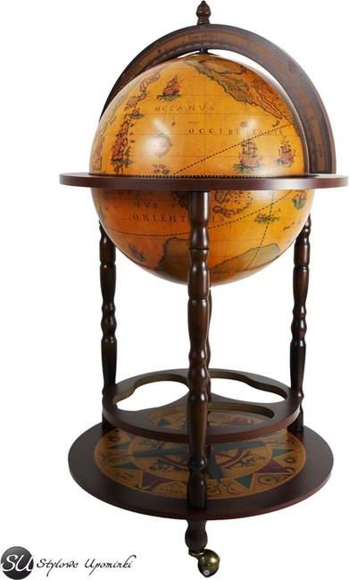 Nadaj swojemu wnętrzu oryginalny charakterElegancki globobar Calipso to połączenie klasycznego designu i funkcjonalności. Globus o średnicy 50 cm został umieszczony na solidnej drewnianej podstawie z kółkami, dzięki czemu wygodnie można go przemieszczać wedle swoich potrzeb. Wewnątrz kuli można pomieścić do 5 butelek oraz 12 szklanek lub kieliszków. Dodatkowo, poszerzona podstawa została zaprojektowana w taki sposób, aby chronić postawione butelki przed przewróceniem.Globobarek Calipso to doskonały wybór dla tych, którzy cenią sobie towarzyskie spotkania w domowym zaciszu. Dzięki temu praktycznemu barkowi na wino, zaskoczysz swoich gości i stworzysz przyjemną atmosferę, nie wychodząc z domu.Klasyczna elegancja w Twoim domuKlasyczne kolory mapy doskonale współgrają z całą konstrukcją globusa. Przestronne wnętrze kuli oferuje idealne warunki do przygotowania i serwowania najlepszych trunków Twoim gościom. Stylizowany globobarek Calipso to także świetne miejsce do przechowywania akcesoriów barowych, karafek, kieliszków oraz ulubionych butelek wina i innych alkoholi, które są chronione przed przewróceniem się przez specjalnie zaprojektowany blat. Dodatkowo, dzięki zamontowanym kółkom bez problemu przeniesiesz barek, gdzie tylko chcesz.Elegancko wykończony barek na whisky w formie globusa wyposażony jest w 3 solidne drewniane nogi oraz podstawę z różą wiatrów, wykonaną przy użyciu naturalnych, wodnych barwników. Kula, której mapa stanowi wierną reprodukcję XVI wiecznej kartografii, obraca się w pełni wokół swojego południka zarówno w pozycji zamkniętej, jak i otwartej.Oryginalny pomysł na prezentStylizowany globobarek Calipso to unikatowy pomysł na prezent z wyjątkowej okazji, na przykład, okrągłej rocznicy lub dla odchodzącego na emeryturę pracownika. Barek na brandy wykonany przez włoskiego producenta Zoffoli zapewnia estetyczny wygląd oraz długotrwałą użyteczność.Dlaczego warto wybrać globobar Calipso? idealny do wyeksponowania w gabinecie lub salonie wymiary: 60x60x98 cm pomieści do pięciu butelek oraz dwanaście kieliszków wyjątkowy prezent, który zachwyci każdego miłośnika podróży i nie tylko! Stylizowany globus w formie barku na alkohol Calipso wzbogaci wieczorne spotkania swoim eleganckim wyglądem i z pewnością przyciągnie wzrok każdego gościa!