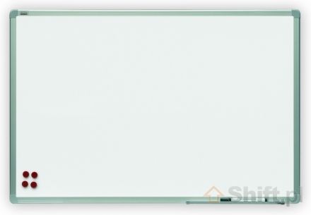 Tablica suchościeralna OfficeBoard lakierowana Tablica biała suchościeralna magnetyczna lakierowana. Rama wykonana z profilu aluminiowego anodowana na kolor srebrny, wykończona eleganckimi popielatymi narożnikami. Produkt wyposażono w wygodną półkę na markery o długości 30cm. Możliwość zawieszenia tablicy zarówno w pionie, jak i w poziomie. Przy rozmiarze 150x100 cm i większym, tył tablicy wzmocniony jest dodatkowo blachą ocynkowaną. Dane techniczne Rozmiar powierzchni użytkowej (szerokość x wysokość): 180 x 90 cm. Powierzchnia tablicy: magnetyczna, lakierowana. Waga: 17 kg Inne, dostępne rodzaje powierzchni: ceramiczna W komplecie: półka na markery, marker, 3 magnesy i elementy mocujące. Gwarancja: 10 lat na powierzchnię lakierowaną i 2 lata na produkt.